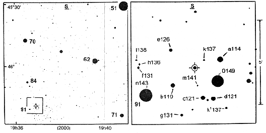 Cette étoile n'est pas répertoriée au GCVS et ne figure pas au NSV. A cette position ne figure aucune variable connue. Nous lui attribuons la dénomination provisoire 1933+46 CTM3 Cyg ( Nous donnons ci-dessous une carte dessinée à partir du GSC à l'aide du logiciel GUIDE 4.0. On se souviendra que les magnitudes visuelles du GSC sont approximatives et, comme pour les deux étoiles précédentes, il conviendra de fournir le détail des comparaisons avec le relevé mensuel.