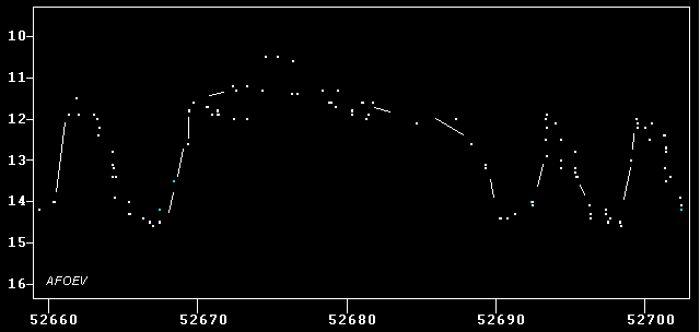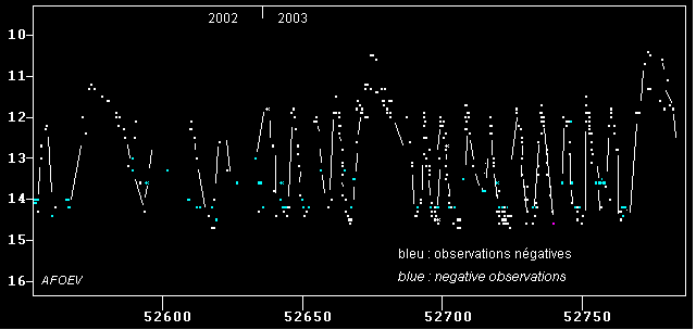 YZ Cancri was observed 7473 times between April 1972 and March 2005. 45 supermaxima were observed whose 20 are uncertain (begin or end of the eruption not observed). The mean lenght of a supermaximum is 18.39 days and the mean magnitude mv 10.7. The table gives details. The mean lenght of normal eruptions is 2.6 days at mv 12.0. Three eruptions were very short : one day. 63 eruptions were determined on the basis of only one observation (mark xx). The figures above shows a supermaximum and a series of observations including 3 supermaxima.